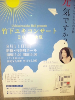 8月11日。暑い~~(*_*)異常な気温!本日は夏休み前最後の仕事、内幸町ホールにてシャンソンライブ『竹下ユキ』さんでした。一部は演劇風な構成、二部はシャンソンにとらわれない選曲。楽しい一日でした~。さて、明日少し事務所作業をしてから夏休み~~(^0^)/。今年も実家鳥取に帰ります。