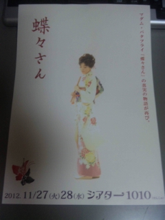 11月25日。土曜・日曜と暖かいせいか渋谷は年末の様な人(*_*)。先日から稽古の為北千住に通ってます。東京のはてからはてといった移動。明日からミュージカル『蝶々さん』北千住1010シアターの舞台仕込みです。前回ツアー震災前近くに終わったので一年半ぶりの再演です。いろいろ思い出しながらの作業中。本番日は火曜・水曜。これを乗りきると年末かな(^_^)。私事ですが渋谷の新しいホールのオーブでTHE BEATLESのミュージカル『レイン』が只今やってるのですが同じ日の為に見に行けない~残念(*_*)。